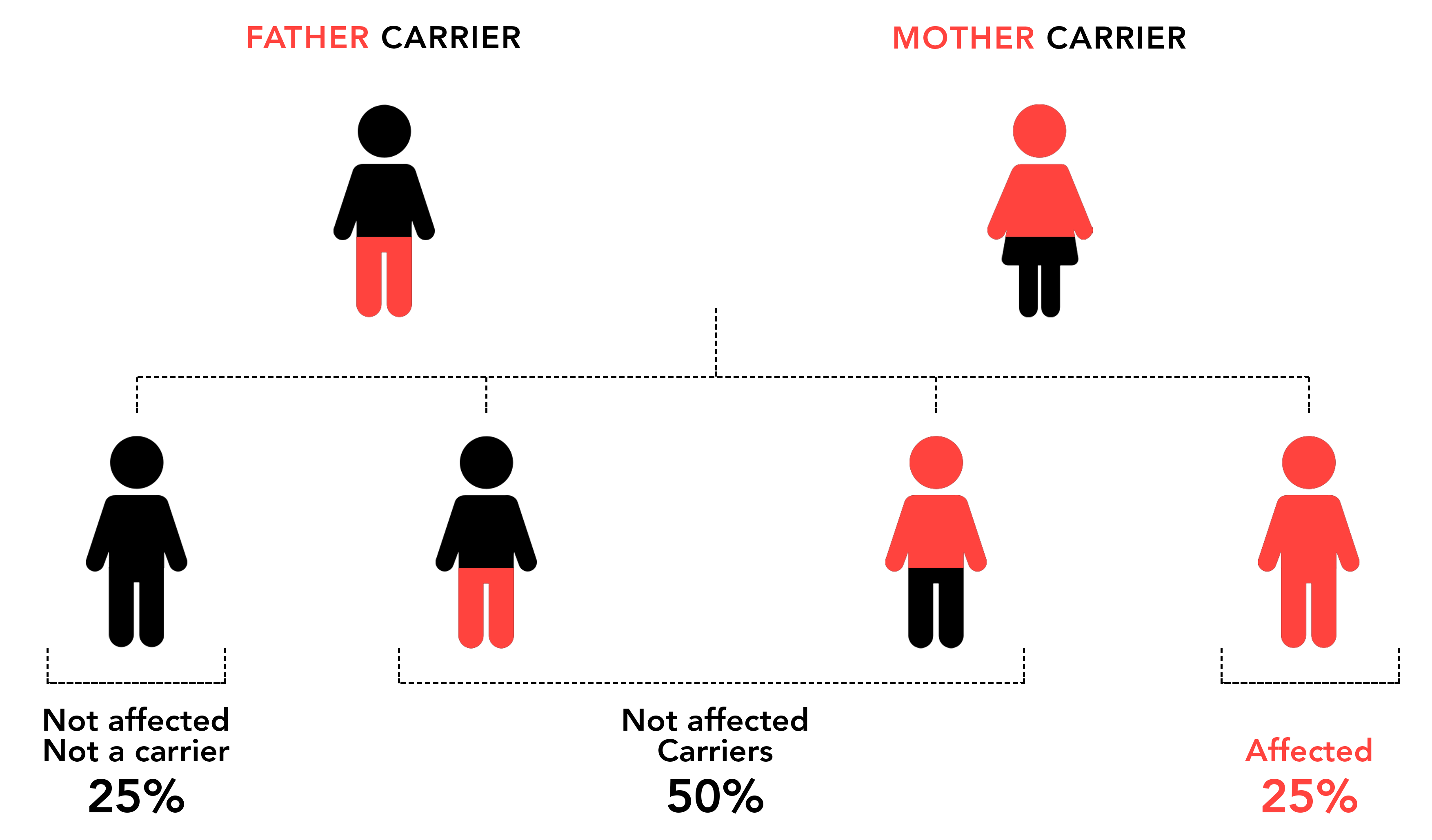 Most people are healthy carriers of one recessive disorder or another. If a person's partner is also a carrier of the same gene mutation, there is a 25% risk of the couple's child having that illness and a 50% risk of the child being a healthy carrier of it, meaning that there could also be implications for the child's family in the future.