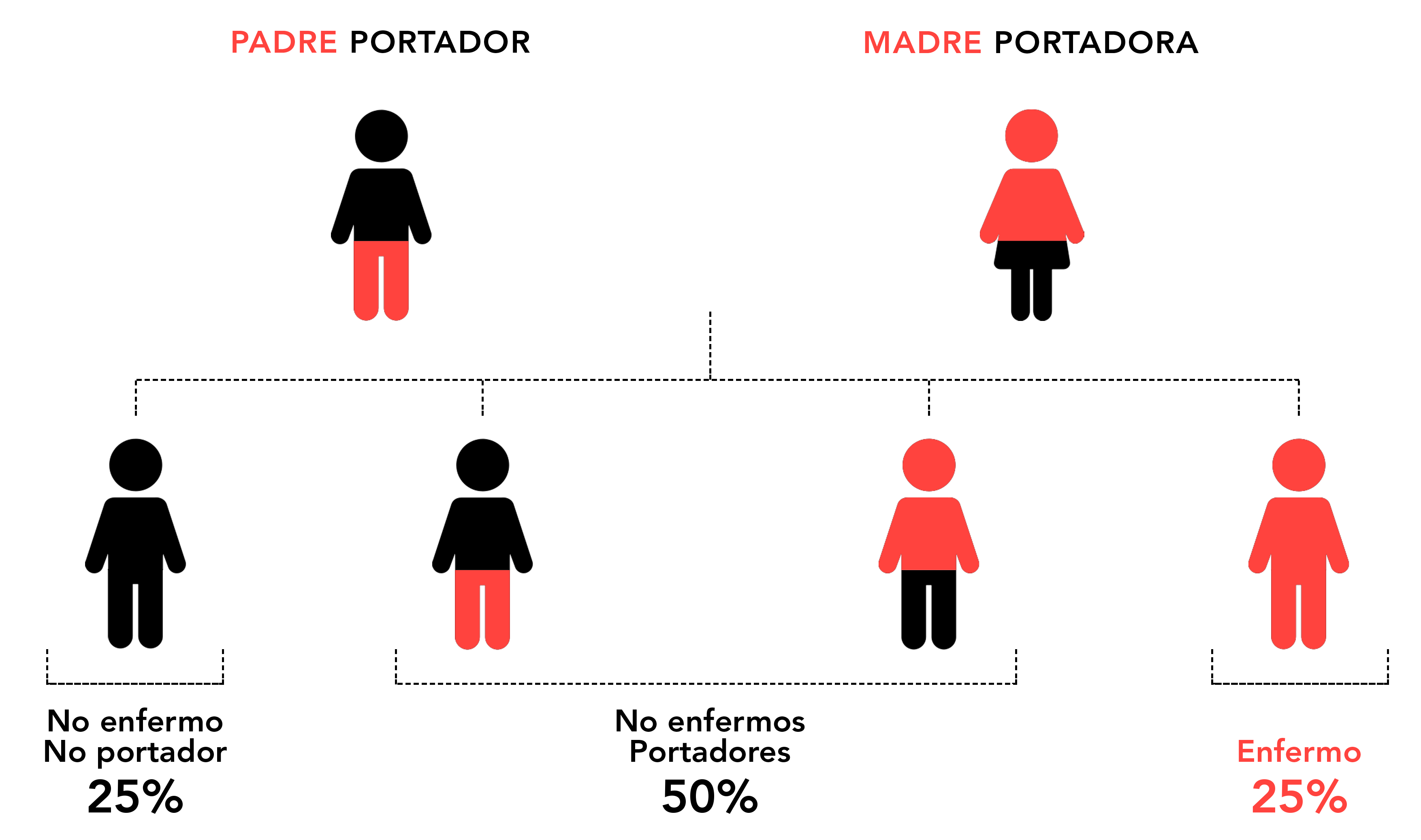 La gran mayoría de las personas somos portadores sanos de alguna enfermedad recesiva. Si nuestra pareja es también portador de la misma mutación en sus genes, el riesgo de que un hijo de la pareja presente esa misma enfermedad es de un 25%, y de que sea portador sano, de un 50%, lo que podría tener implicaciones también para su futura descendencia.
